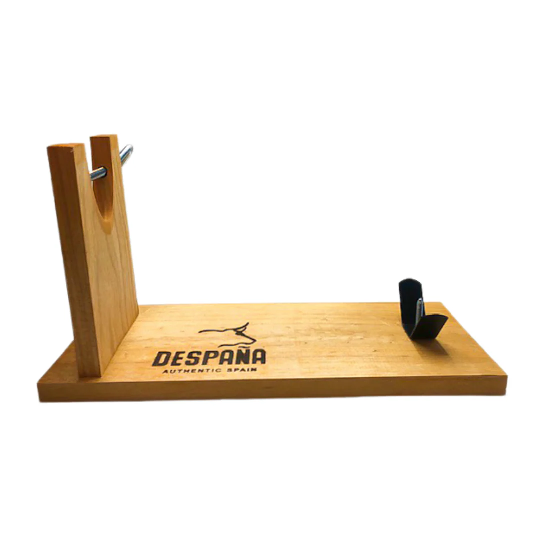Straight from Spain, this "banqueta" jamón holder/jamonera was built as a functional and basic entry level ham holder. A great way to economically support and slice your favorite jamón. With its basic shape and wood finish, this holder will serve as a solid beginning option for carving your Spanish ham.
